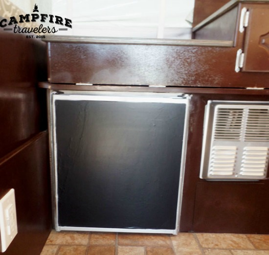 They also removed all the hardware and gave it a good coat of primer and brushed nickel spray paint. After a failed attempt at spray painting the fridge, Mandy took a cue from our remodel and covered her mistakes with adhesive chalkboard vinyl. I love the way it looks with those chocolate cabinets. Nice job, Mandy! 😀