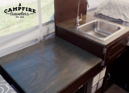 Since they were replacing the countertops anyway, Jason and Mandy really wanted to replace the sink faucet as well. Their family primarily camps with hookups, so they really didn’t use the water tank. They got rid of the broken pump faucet and replaced it with a brushed nickel one. They also removed the tank to allow for extra storage space. If they happen to camp somewhere without water hookups, they simply revert back to their tent camping ways and bring a container of water inside.