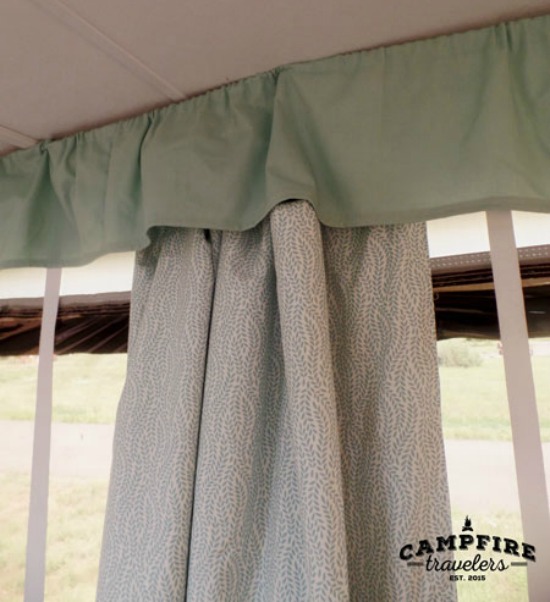 While Mandy really loved her neutral color palette, she knew she’d need to break away from it a bit and add an accent color. The curtains seemed like the perfect place to do this. She and Jason were in agreement on the color–aqua–but they just couldn’t find a fabric they liked. Mandy found some inexpensive sheets at Walmart that proved to be the perfect solution. She purchased some Roc-Lon blackout liner to give the curtains some weight and ensure privacy when they were closed. She used Airstream Drape Carriers (you can read about that here) to replace her old curtain tabs. Worked like a charm! 😀