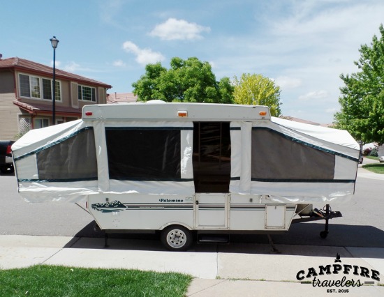 I’m so excited to bring you a fantastic pop up camper makeover from fellow bloggers, Jason and Mandy, over at Campfire Travelers. They are a cute little family from Colorado with a wonderful blog about experiencing the great outdoors with your kids. Last year, Mandy had visited the blog to ask questions about cleaning her canvas. I stopped by their blog and was so impressed by the amazing results they achieved (you may remember I mentioned it here). Well, I’ve been watching their camper remodel progress, and I was so excited when they posted their big reveal. I just knew I had to share it all with you. Let’s start at the beginning, shall we?