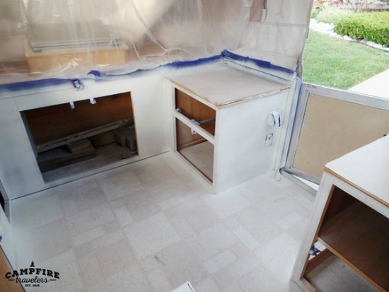 Now that the canvas looked brand new, they started working on the interior of the camper. The first major project was painting the cabinets. Jason and Mandy liked the look of Cyndie’s Pop Up Camper Makeover and wanted to achieve a similar look. They opted to paint the cabinets a rich, chocolate brown color using Rustoleum spray paint.