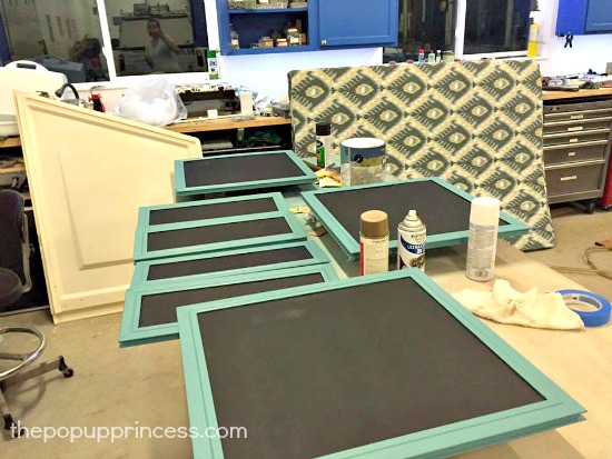After cleaning them well, Joy left all the wood cabinets in the camper alone. They were in great shape, and she wasn’t sure about how well painted cabinets would hold up to abuse. She did paint the interior of the doors with a spray chalkboard paint, though. Then she came back and trimmed them out with the same color she used on the walls.