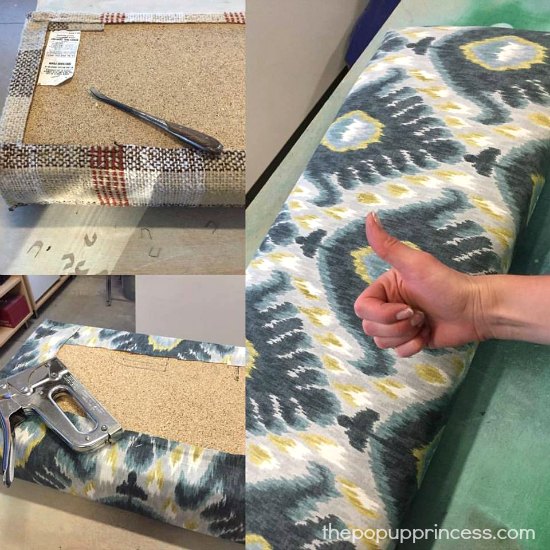 Joy got to work on the interior of the camper. The old tweed cushion fabric was disintegrating, so she cut it off all of and removed all of the staples. She washed the foam and let it air dry so she could reuse it. Once it was dry, Joy recovered the cushions with cute upholstery fabric she bought from a local store called S.R. Harris.