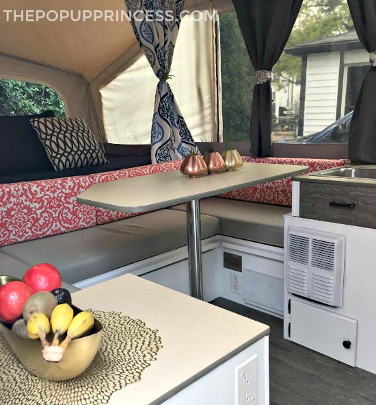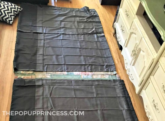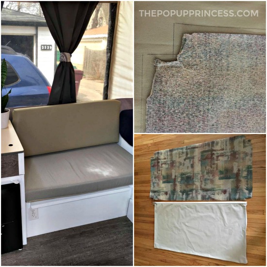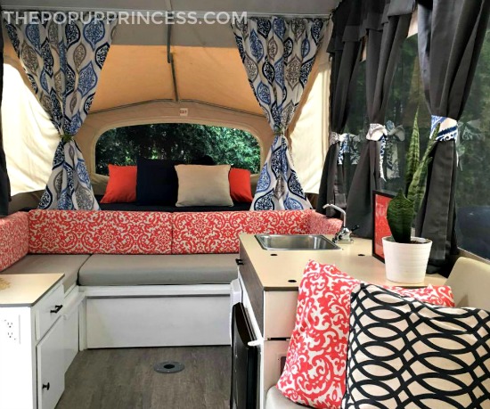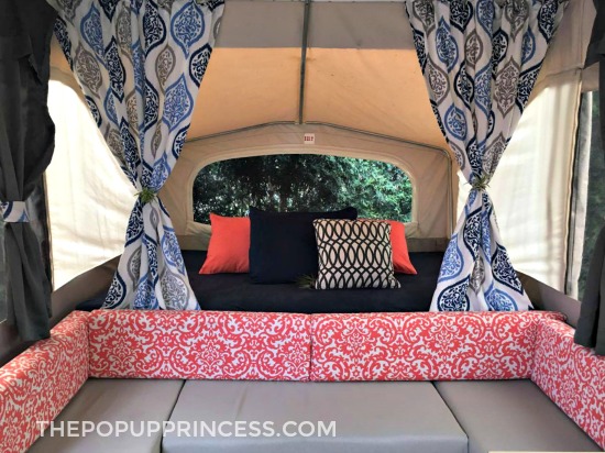 Lori found inspiration from this blog and her friend, Jessica, who had just remodeled her own pop up, so she decided to complete a makeover on her own PUP. She started with dark gray pre-made blackout curtains and based her makeover plan around them. Lori cut the tabs off the old curtains and sewed them onto the new curtains. She used all the leftover fabric to make tiebacks.