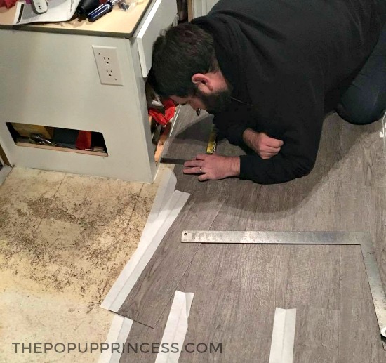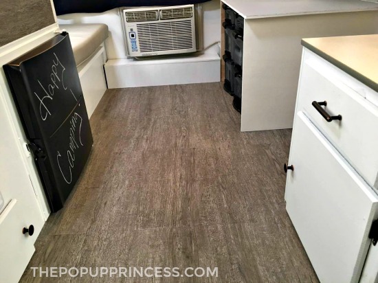 Last up was the flooring. Lori and Nick installed a new vinyl planks over the existing linoleum. It cost them about $80 to do the whole camper, and it really completes the new look. I just love the way it looks with those crisp white cabinets. (And just in case you are wondering, the A/C unit was installed by the previous owners. Nick and Lori don’t have any instructions on that one. 😉 )