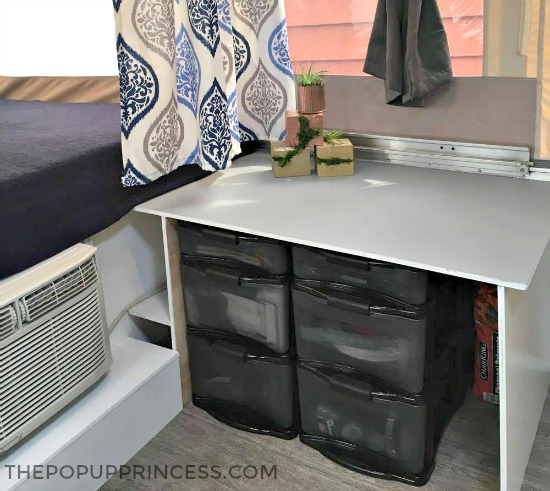 Lori and Nick didn’t need the extra sleeping area on the other side of the camper, but they were really short on storage space. To give themselves some extra room to store all their camping essentials, they removed the seating area and made a custom storage area.